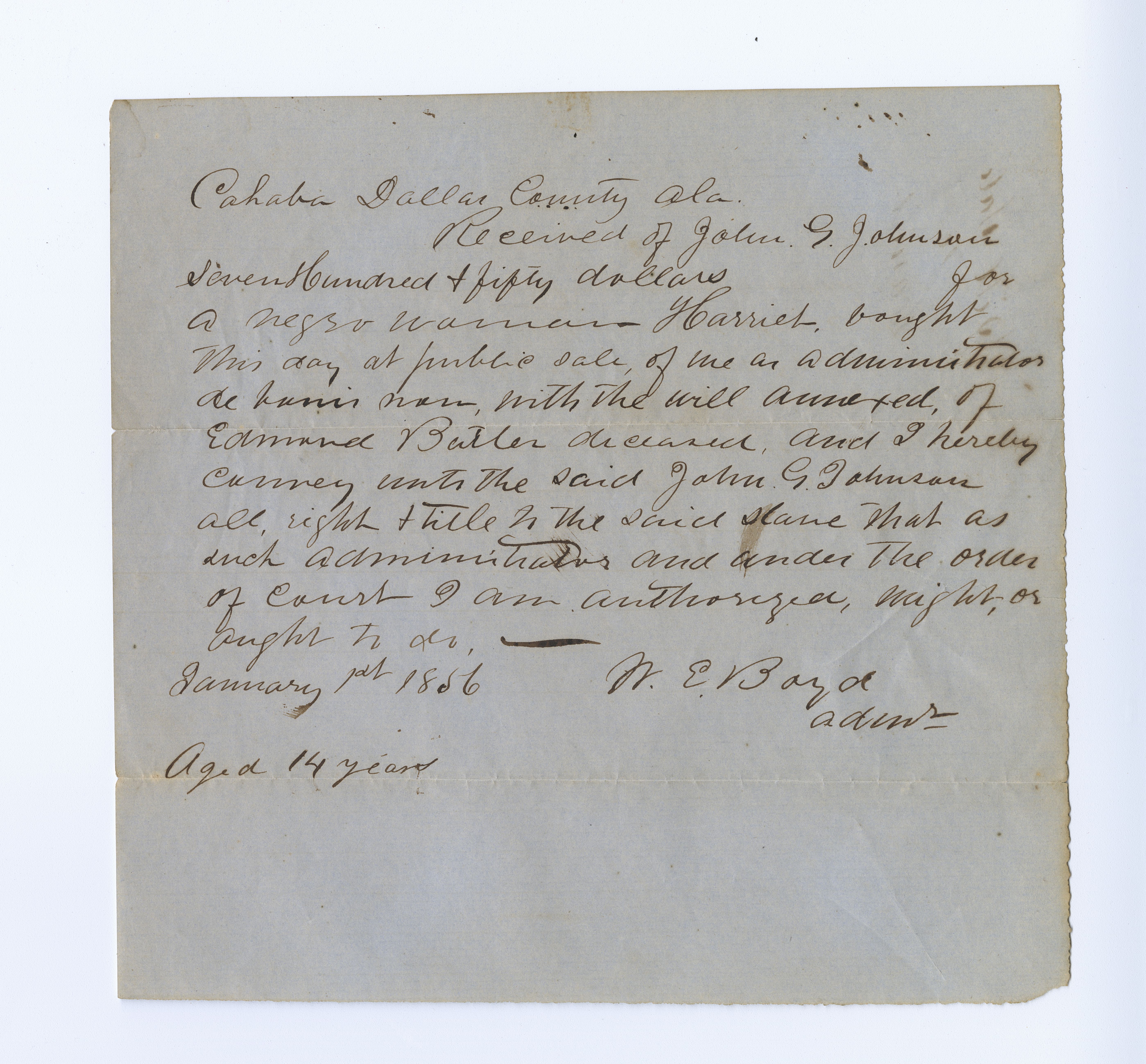 A rare 1856 letter from W. E. Boyd to John G. Johnson regarding the seven hundred and fifty dollar ($750) purchase of a fourteen-year-old negro girl named Harriet.
