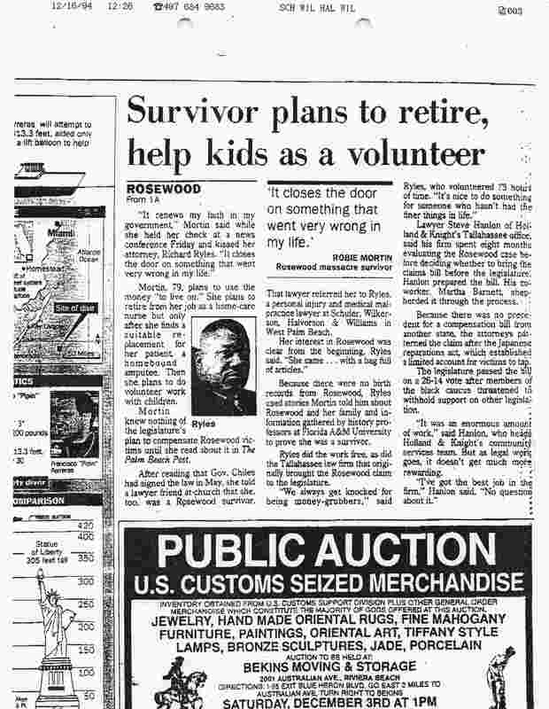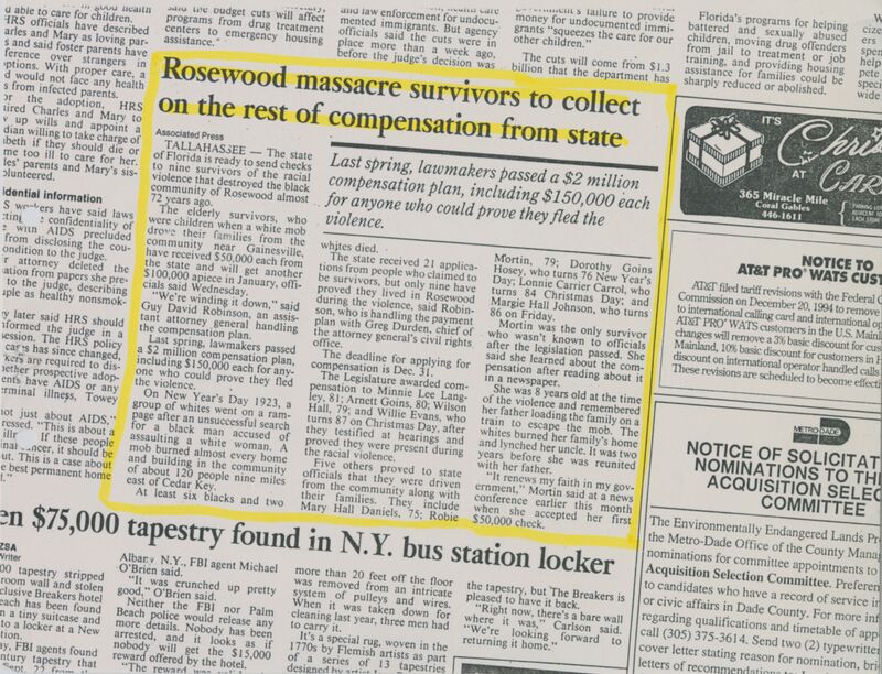Newspaper Article: State Civils Rights Office Begins Rosewood Compensation Efforts