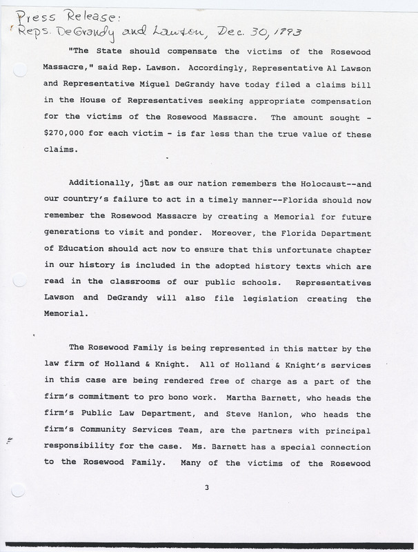 Press Release on the Rosewood Massacre Investigation and Compensation Efforts