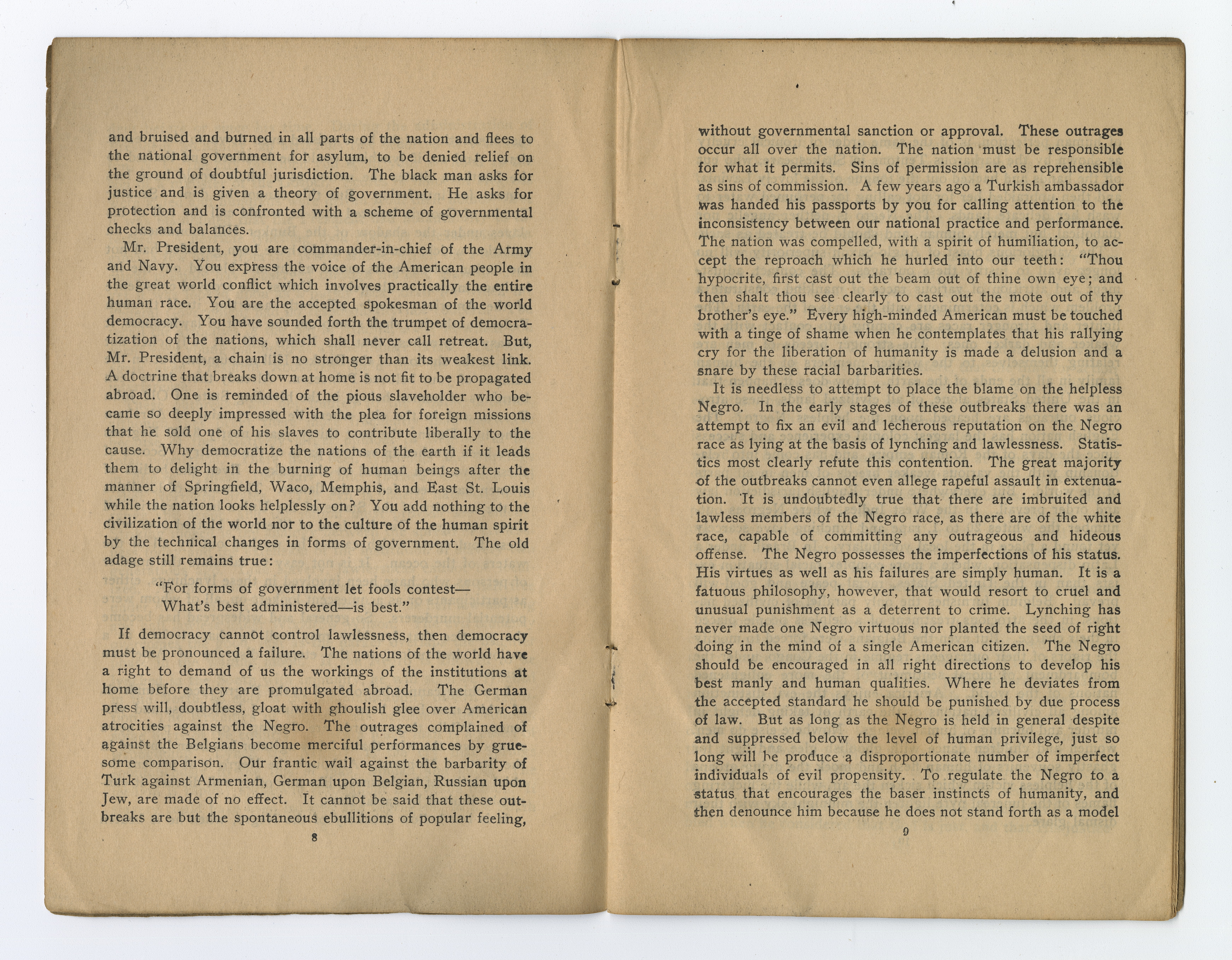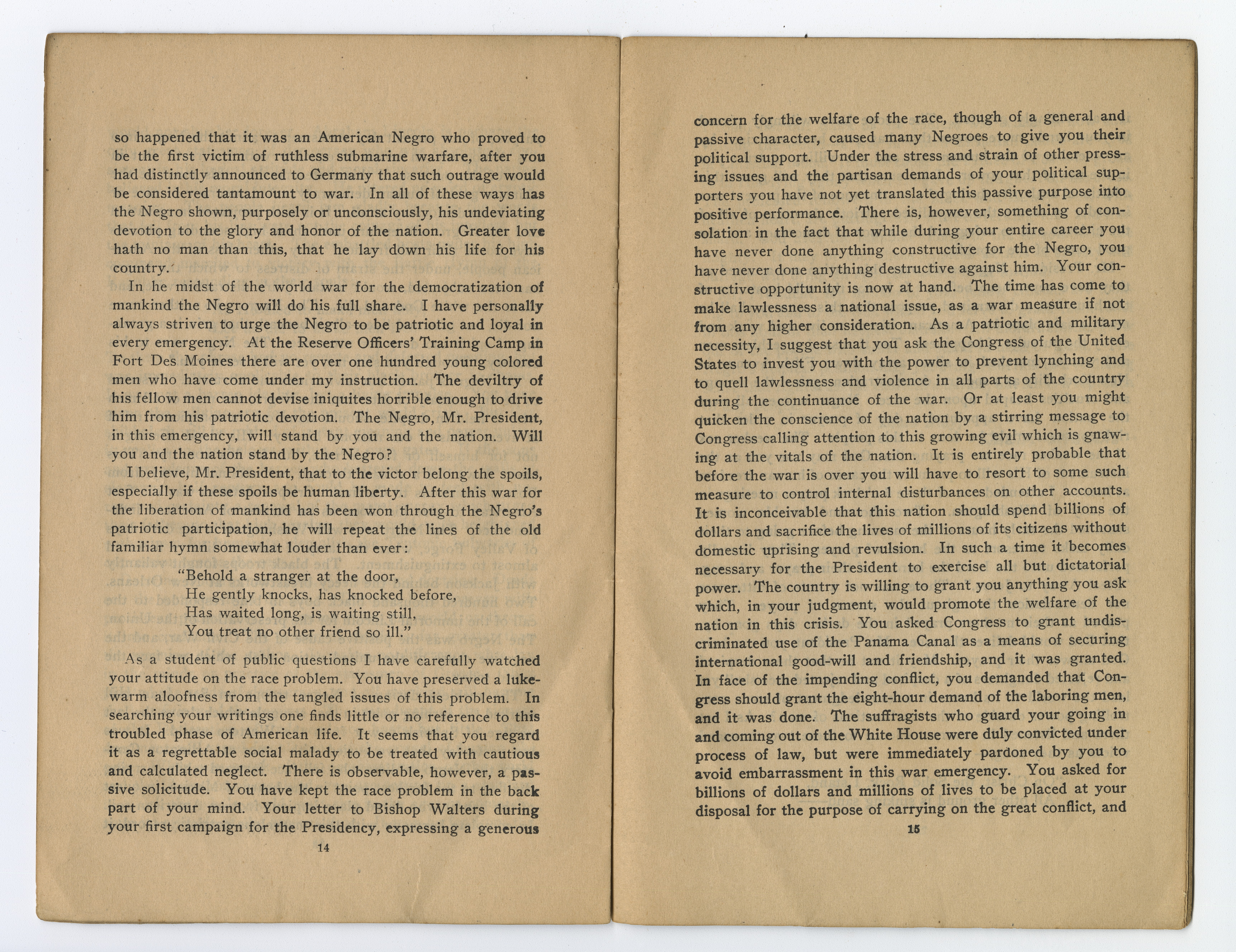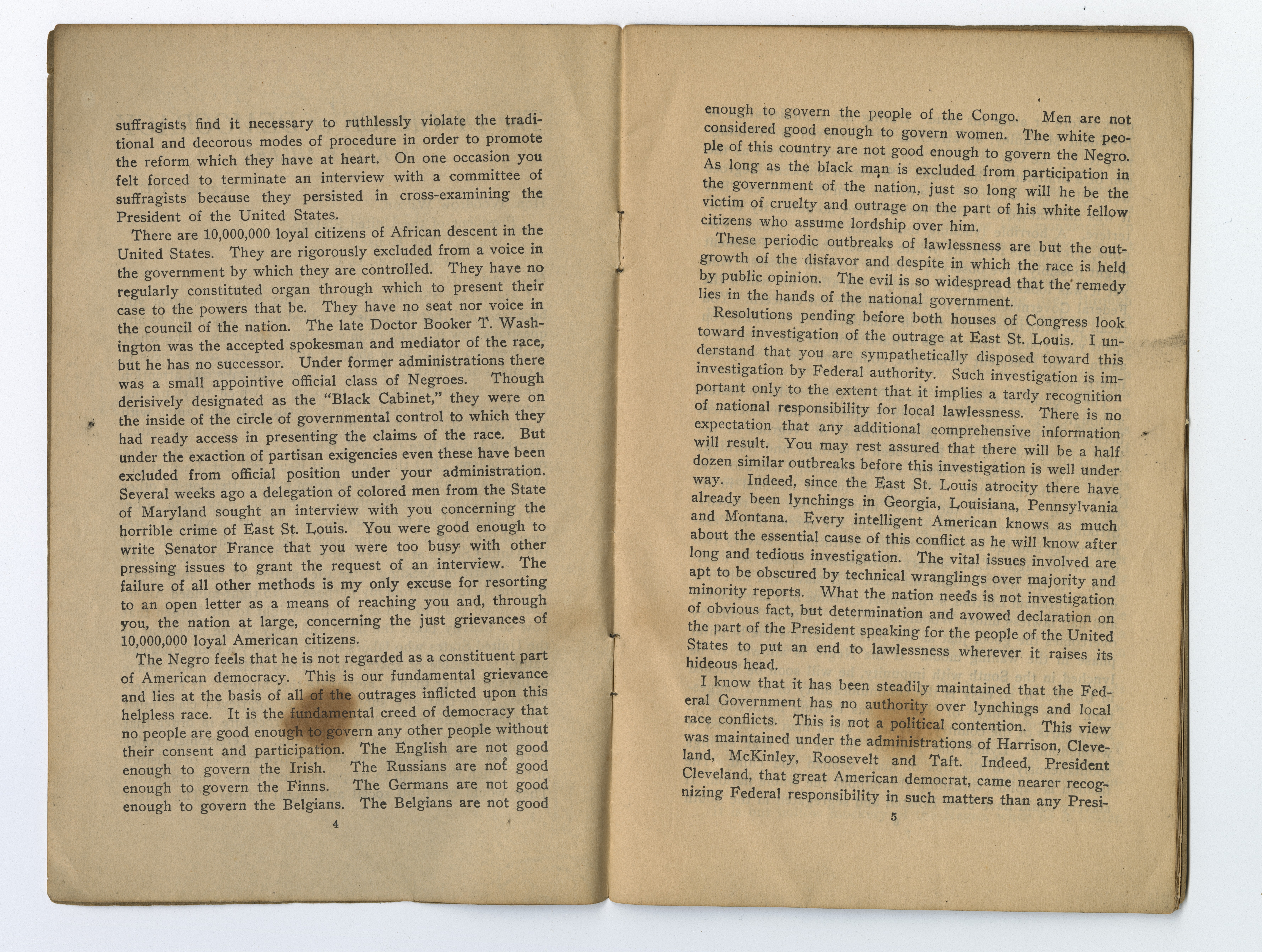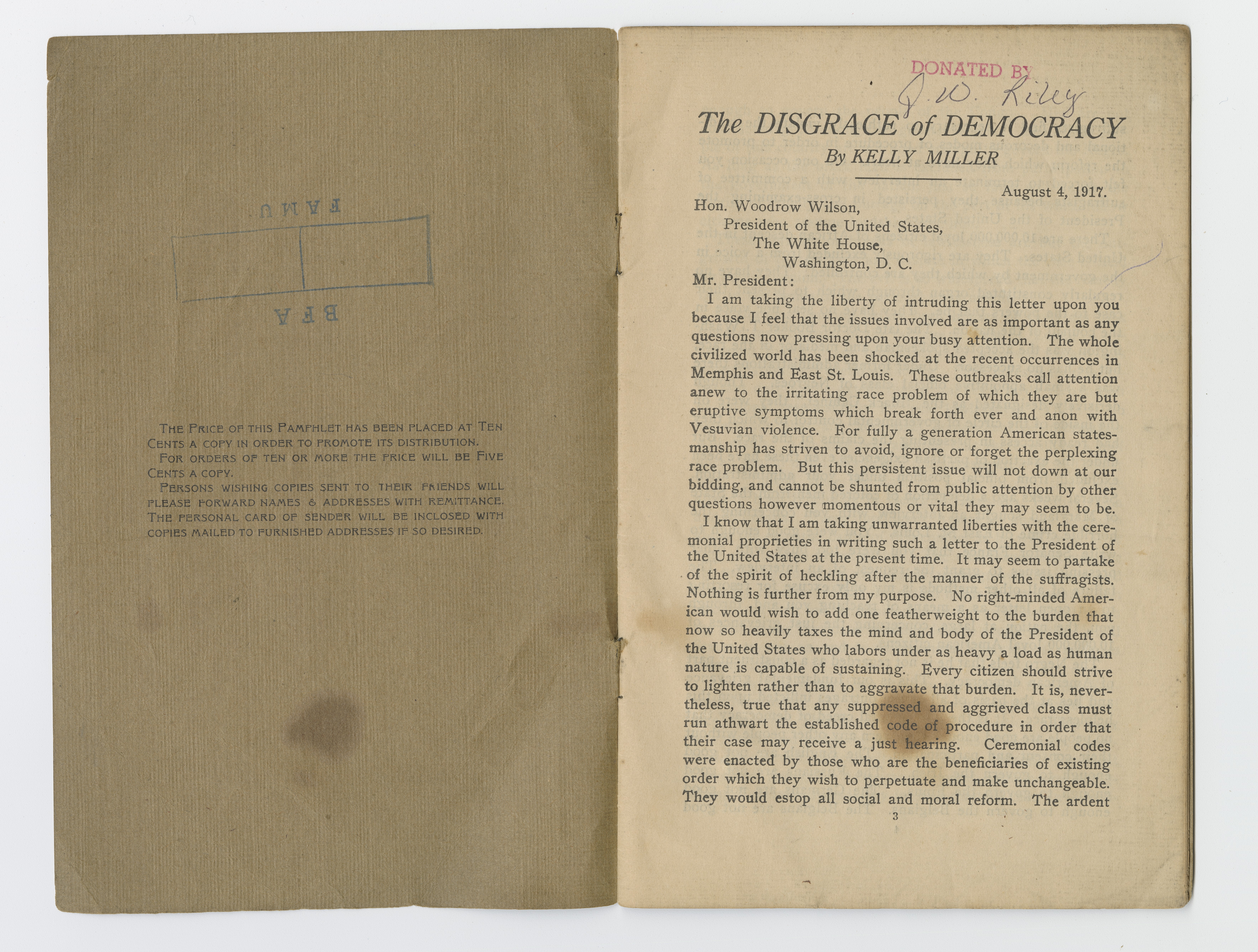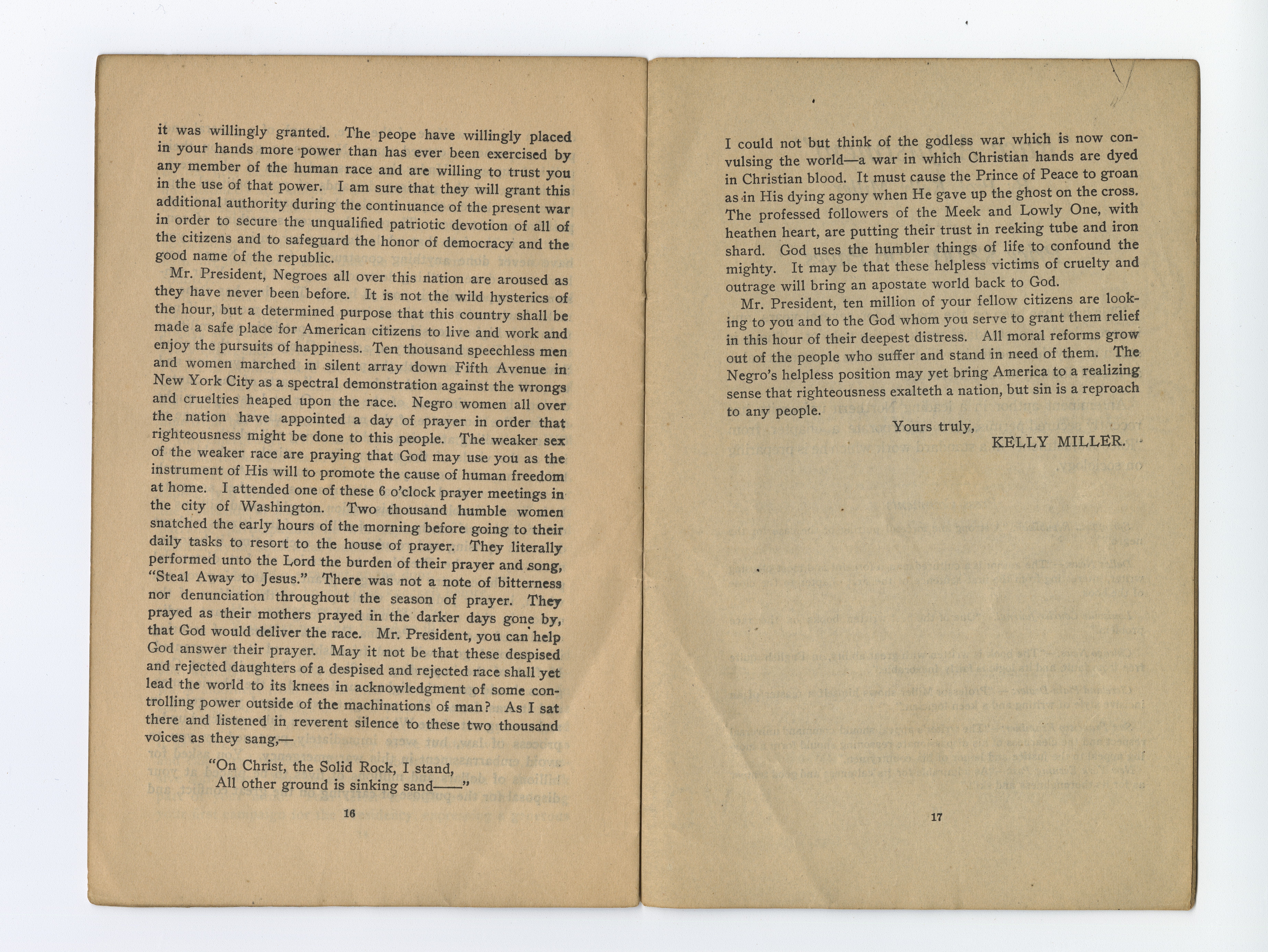 - In 1917, Black intellectual Kelly Miller wrote to President Woodrow Wilson, condemning the unjust treatment of African Americans. Using biblical references, he criticized lynchings, highlighted systemic inequality, and pleaded for relief for the 10 million Black citizens enduring deep distress, emphasizing their innocence and dignity.