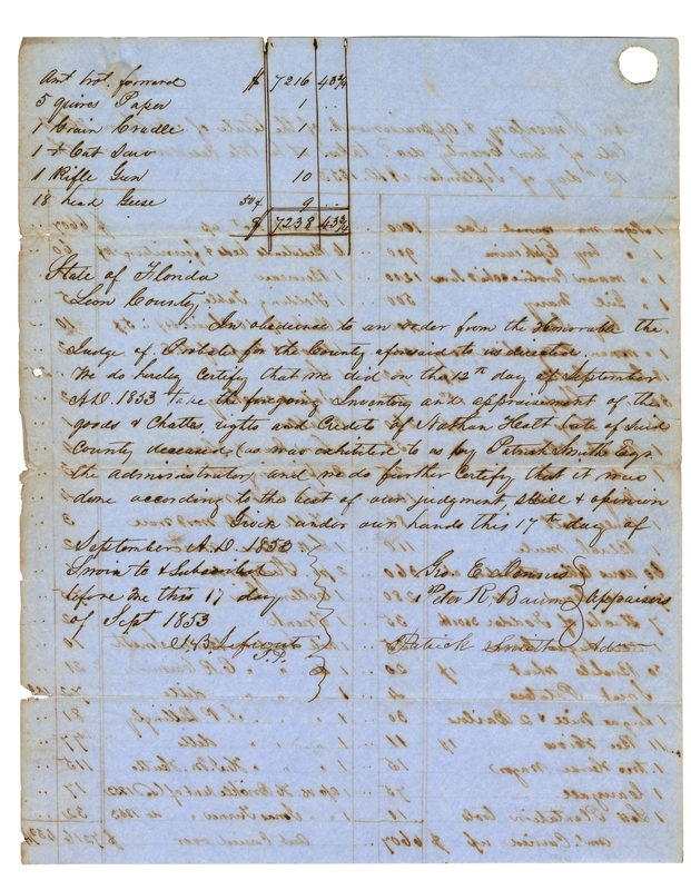- These rare 1853 slavery documents from the estate of Nathan Holt in Leon County detail the inventory, valuation, and transfer of enslaved individuals. These records offer crucial insights into the management and distribution of enslaved labor within an estate, reflecting the economic and social structures of slavery in mid-19th century Florida.