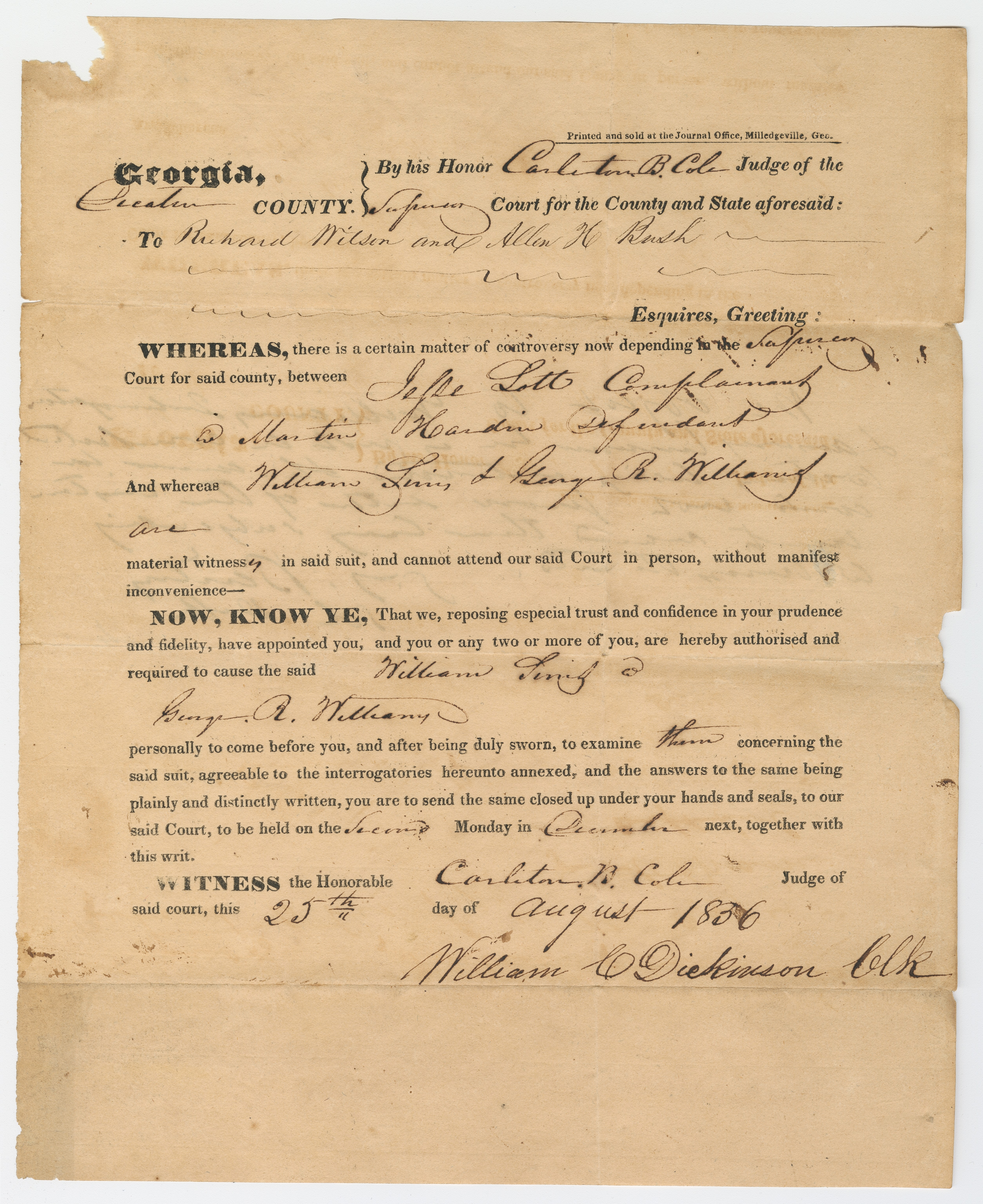 - This legal document depicts a Decatur County civil lawsuit between complainant Mr. Lott and defendant Martin Hardin with the Honorable Judge Carleton B. Cole presiding. It is dated August 25, 1836.